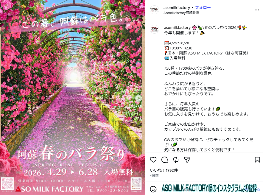 熊本県阿蘇市にありますASO MILK FACTORYで今年も4月29日から6月28日まで春のバラ祭りが開催されます!