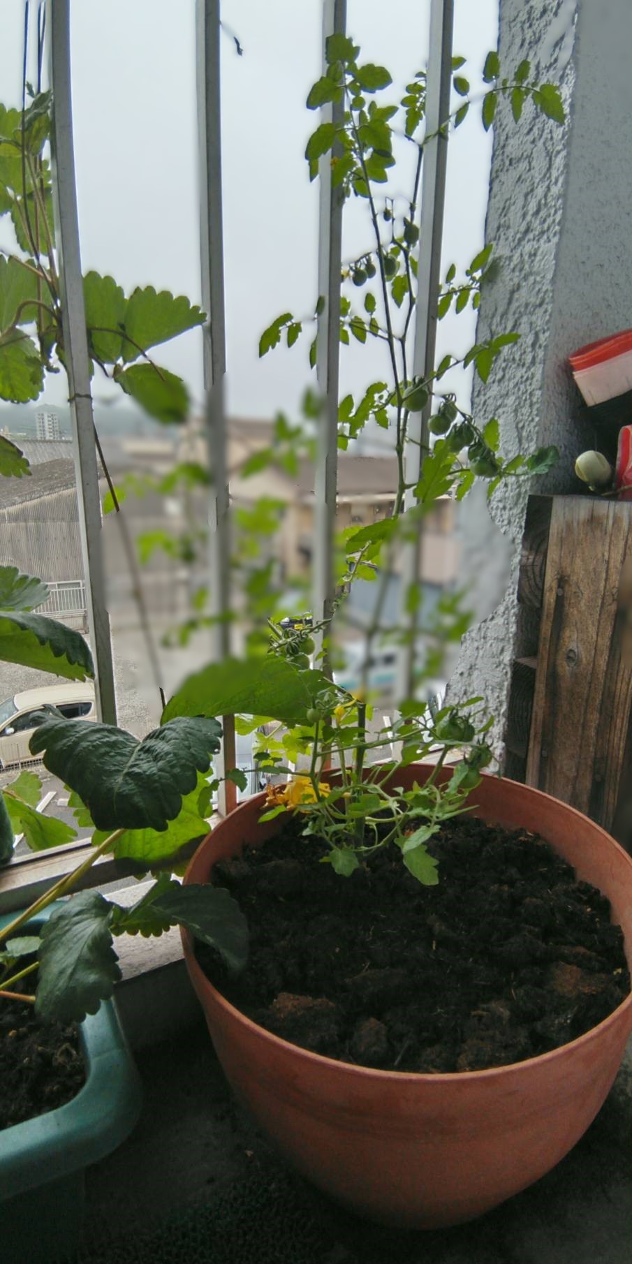 - 鉢植えのバラ、家庭菜園のキュウリ、トマト、バジル